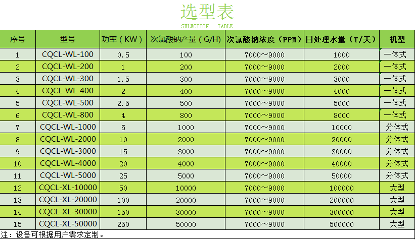 CQCL-WL全自動次氯酸鈉發(fā)生器是產(chǎn)量大于1000g/h以上的成套設(shè)備,由于產(chǎn)量大,鹽耗量和電耗量都較大,成套設(shè)備包括溶鹽配鹽系統(tǒng)、動力供電控制系統(tǒng)、電解電源系統(tǒng)、軟水系統(tǒng)、排氫系統(tǒng)、成品存貯及投加系統(tǒng)、自動酸洗和PLC控制系統(tǒng)。