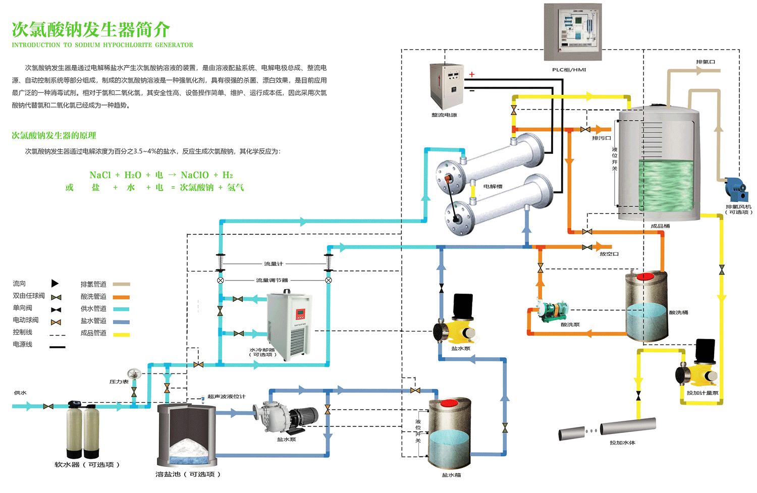 ● 電解用飽和鹽水由鹽水計量泵精確控制,電解軟水用的流量計可以高位限制低位報警。